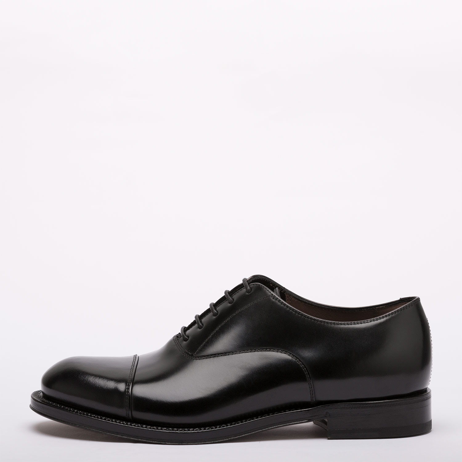 Suitable for pairing with tailored, tight-fitting or pinstriped suits: it is made of full-grain black calfskin, lined with calfskin and constructed with a leather bottom in the traditional Blake Rapid workmanship.