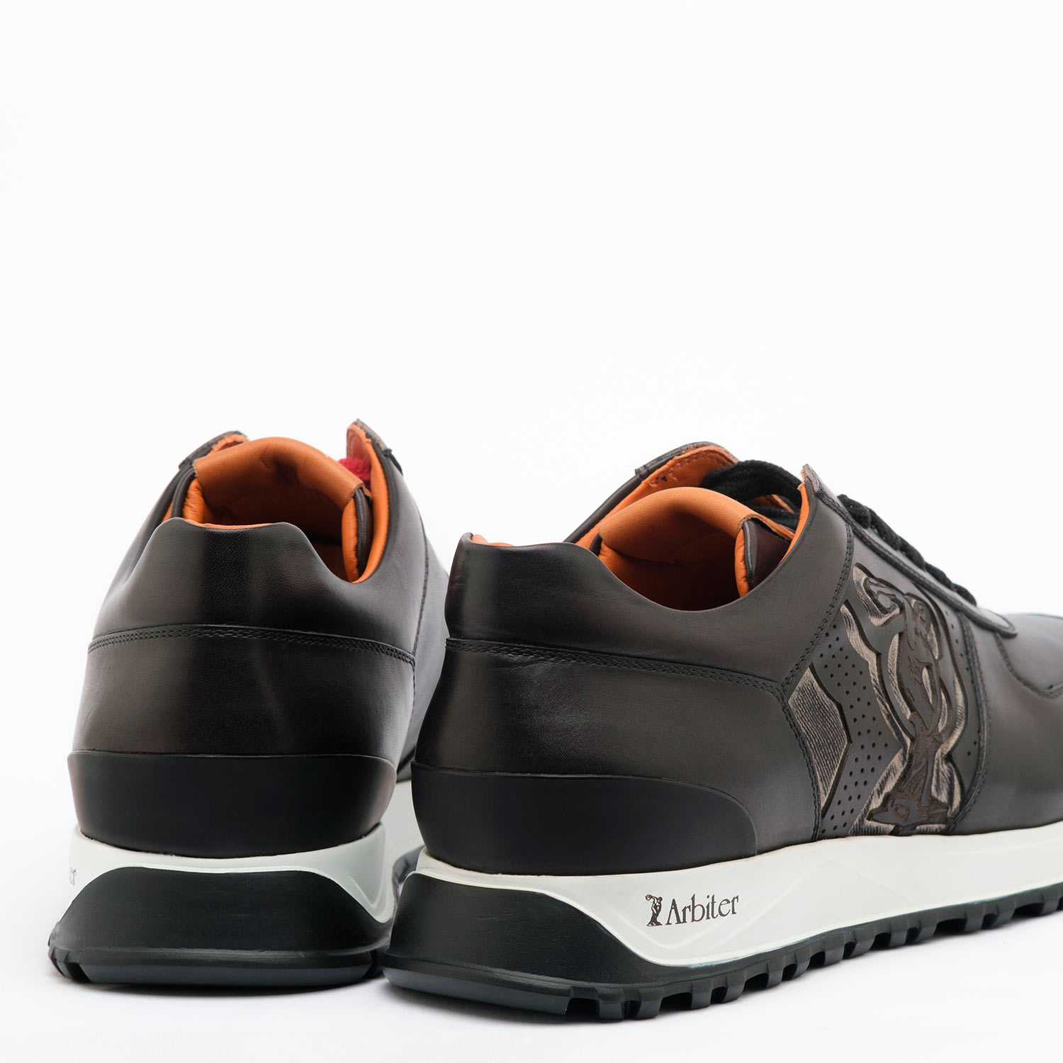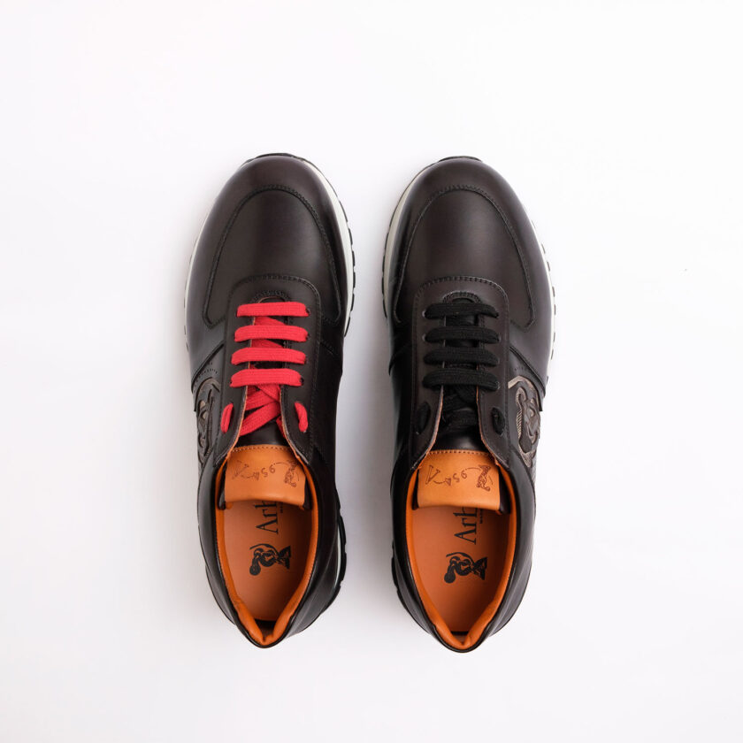 Olympia is a sneaker completely handcrafted by our experienced artisans, so it is of high workmanship. Realizzata in pelle di vitello nera di alta qualità, la nostra Olympia è ben più di una classica scarpa sportiva: ha una suola bianca di circa 3,5 cm ed è inoltre dotata di plantare anatomico estraibile rivestito in vitello.